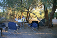 Wir kommen vorbei Stovepipe Wells, hier hatten wir das letzte mal gezeltet und auch mit Andy hatten wir bereits 1995 hier unser Lager aufgeschlagen. Heute ist der Campground geschlossen, ist nur von Mitte Oktober bis Mitte April geöffnet. Also gehts weiter nach Furnace Creek, dem Campground neben dem Visitor Center. Nach einer kompletten Platzumrundung haben wir auch die Campsite unserer Wahl gefunden, bauen kurz das Zelt auf und genießen die Ruhe und Hitze im Schatten und freuen uns über den leichten Luftzeug, der die Hitze sehr gut erträglich macht. Nach all der letzten Zeit mit dem kalten Wetter, in Deutschland aber auch hier, tut es richtig gut, nur dazusitzen und leicht schwitzen zu können. Fast hatten wir schon vergessen, wie das geht.